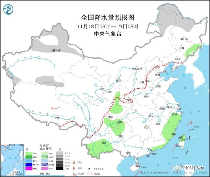 11月17日08時至18日08時,新疆北部、內(nèi)蒙古東北部、黑龍江西北部和南部、吉林東部等地的部分地區(qū)有小到中雪或雨夾雪,其中,新疆阿勒泰地區(qū)、內(nèi)蒙古東北部、黑龍江西北部的部分地區(qū)有大到暴雪(10~15毫米)。遼寧東部、江南南部和東部、重慶大部、貴州東部和南部、云南中南部、華南西部和北部等地部分地區(qū)有小到中雨。內(nèi)蒙古東北部、遼東半島等地部分地區(qū)有5~7級風(fēng),其中,新疆北部部分地區(qū)有7~8級風(fēng)(見圖2)。