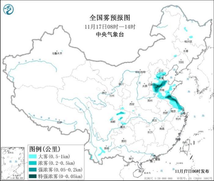17日至18日,華北中南部、黃淮、江漢等地大氣擴散條件較差,上述地區(qū)有輕至中度霾天氣。預(yù)計今天早晨至上午,北京東南部、天津大部、河北東部和南部、山東北部和西南部、江蘇大部、上海東部以及四川盆地部分地區(qū)有大霧,其中,河北南部、山東北部、江蘇東部等地的部分地區(qū)有能見度不足200米的強濃霧,局地能見度不足50米。中央氣象臺11月17日06時繼續(xù)發(fā)布大霧黃色預(yù)警。19至20日,區(qū)域北部霾逐漸減弱消散,但區(qū)域南部仍有輕至中度霾。21日,受西北路較強冷空氣影響,中東部大部地區(qū)霾減弱消散。