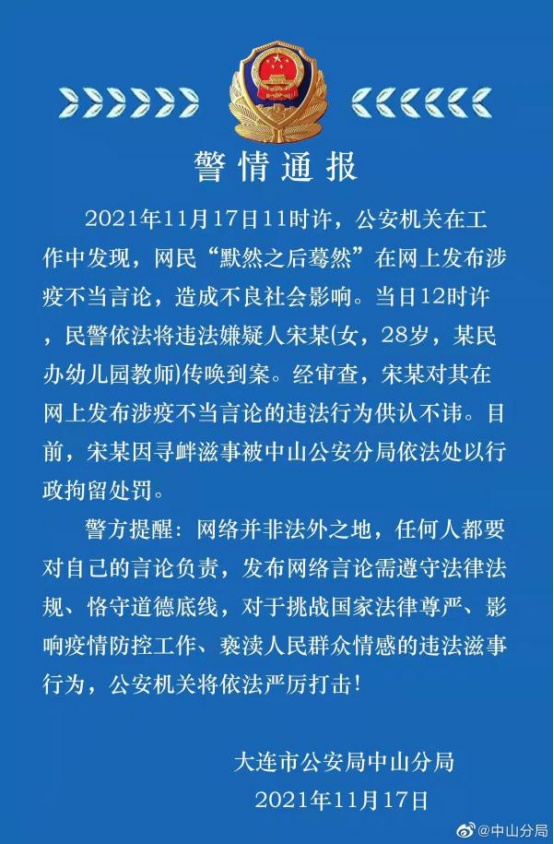 ·女幼師發(fā)文“希望大連疫情越多越好”,因涉嫌尋釁滋事已被行政拘留。目前,幼兒園已經(jīng)對其做出開除決定。