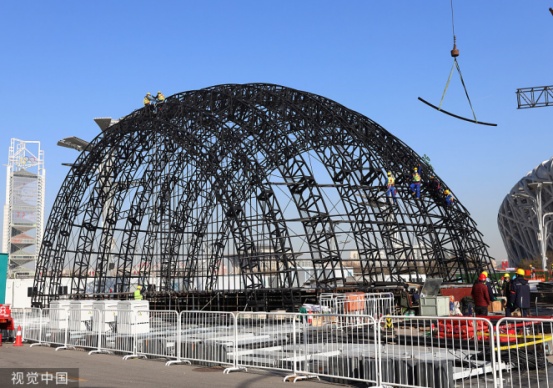 2022年冬奧會(huì)北京頒獎(jiǎng)廣場(chǎng)在北京國(guó)家游泳中心東側(cè)搭建施工中,頒獎(jiǎng)廣場(chǎng)半圓弧主體鋼架結(jié)構(gòu)雛形初現(xiàn)。