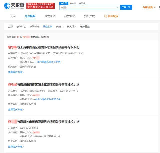 開庭公告信息顯示,包某關(guān)聯(lián)40多起涉及侵害商標(biāo)權(quán)糾紛,被告為四川、福建、陜西、湖南等多地小吃店、燒烤店。包某要求被告拆除店內(nèi)帶有“眼鏡”等相同或近似標(biāo)識(shí)的店招、門頭,并索賠數(shù)萬元。其中,多起訴訟被法院駁回或原告撤訴。