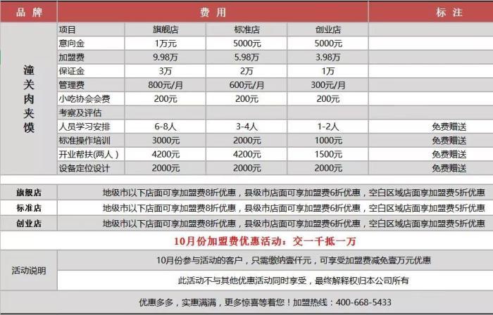 申請(qǐng)商標(biāo)后,“潼關(guān)肉夾饃”就開放了品牌授權(quán)和加盟體系。該協(xié)會(huì)發(fā)布的加盟費(fèi)用表顯示,加盟潼關(guān)肉夾饃旗艦店、標(biāo)準(zhǔn)店和創(chuàng)業(yè)店的費(fèi)用分別為9.98萬元、5.98萬元、3.98萬元,加上各類雜費(fèi),上述三類店鋪的加盟總費(fèi)用約為14萬元、9萬元、5萬元。