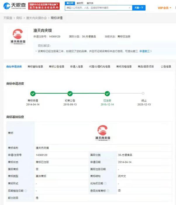 天眼查信息顯示,“潼關(guān)肉夾饃協(xié)會(huì)”成功注冊(cè)的僅有方便食品類“潼關(guān)肉夾饃”一枚商標(biāo),申請(qǐng)日期為2014年4月,專用權(quán)期限至2025年12月。