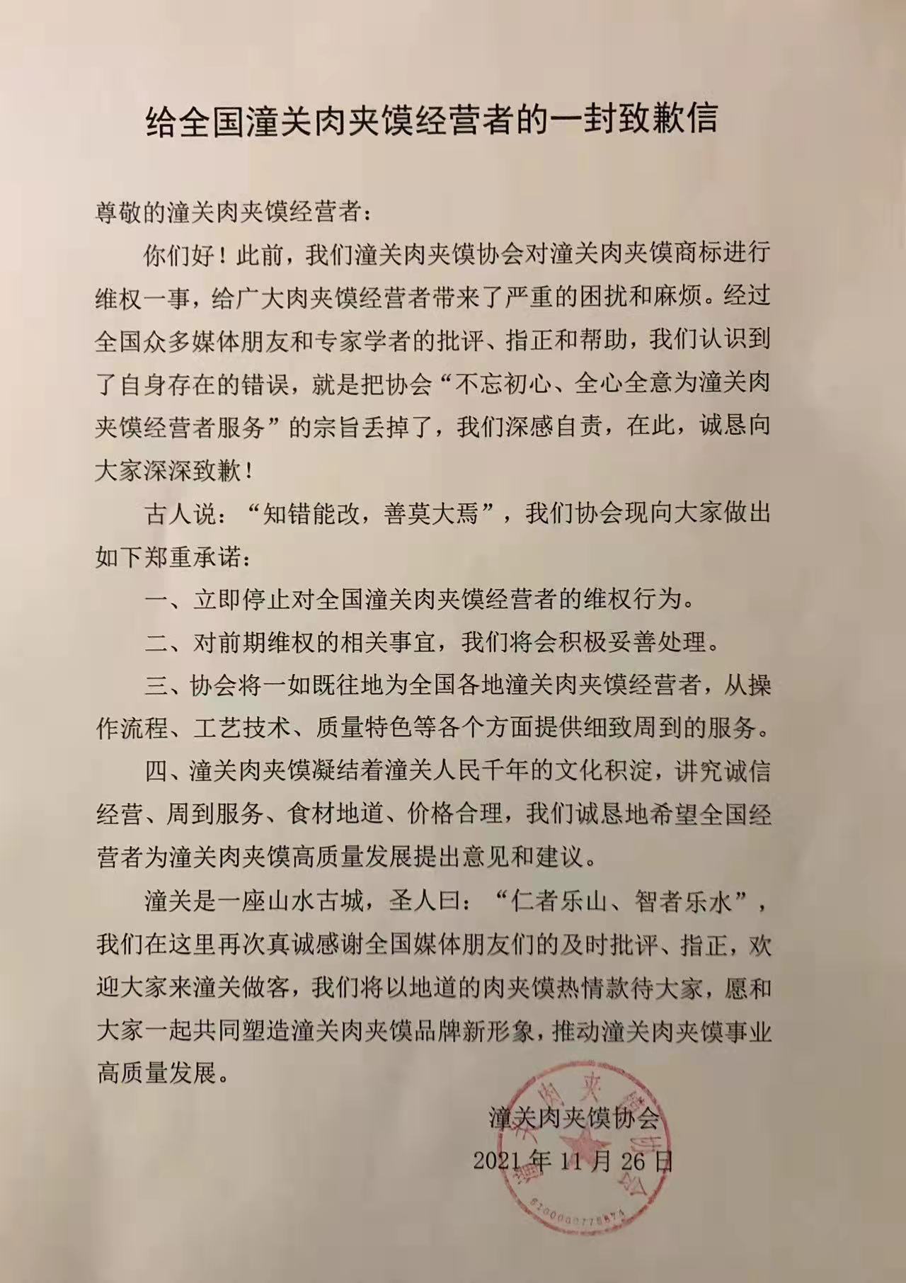 11月26日,潼關(guān)肉夾饃協(xié)會(huì)就潼關(guān)肉夾饃商標(biāo)進(jìn)行維權(quán)一事發(fā)表致歉信,并表示立即停止對(duì)全國(guó)潼關(guān)肉夾饃經(jīng)營(yíng)者的維權(quán)行為。