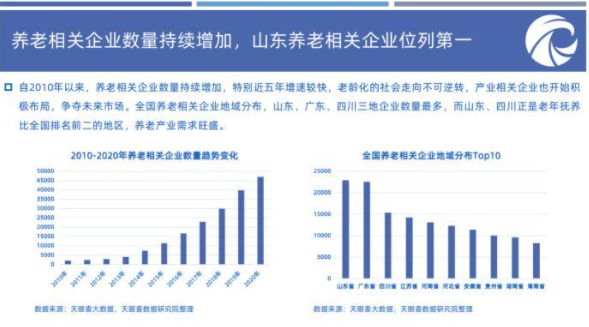 銀發(fā)族的增加催熱了銀發(fā)經(jīng)濟,老人電商,老年旅游、保險理財、智能健康管理、居家照護、營養(yǎng)與保健品都潛藏著巨大空間。自2010年以來,養(yǎng)老相關企業(yè)數(shù)量持續(xù)增加,近5年增速尤其快;其中數(shù)量排名前十的地域為山東、廣東、四川、江蘇、河南、河北、安徽、貴州、湖南、海南。