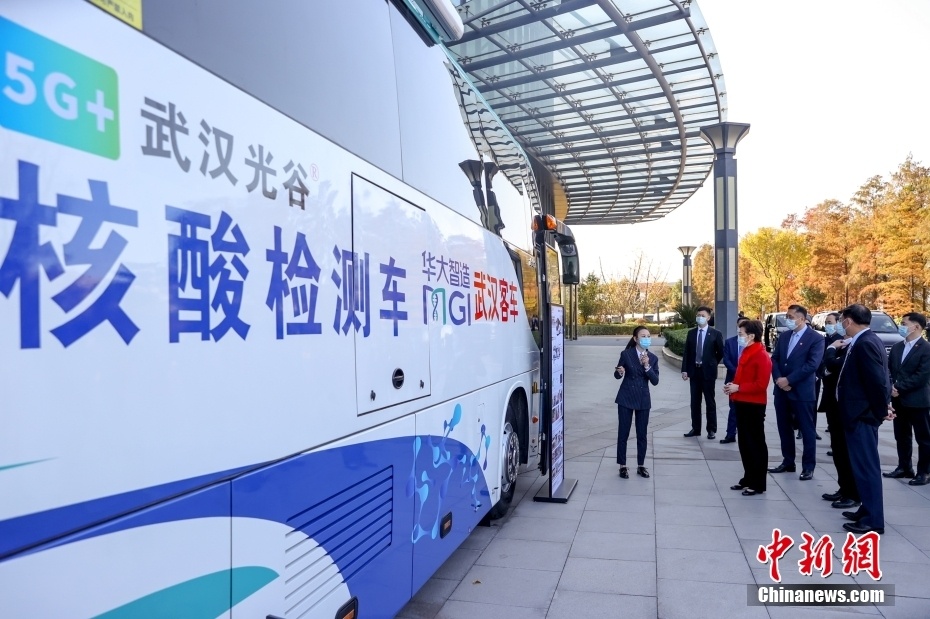 圖為林鄭月娥在中國信科集團參觀5G核酸檢測車。