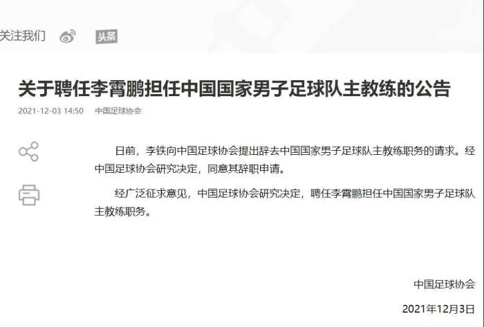 中新網(wǎng)客戶端北京12月3日(劉星晨)12強賽國足表現(xiàn)不佳,32分鐘賽后新聞發(fā)布會充滿爭議,這些讓球迷們再一次喊出了“換李鐵”。3日,中國足球協(xié)會正式發(fā)布公告,同意李鐵的辭職請求,聘任李霄鵬擔任國足主教練職務(wù)。