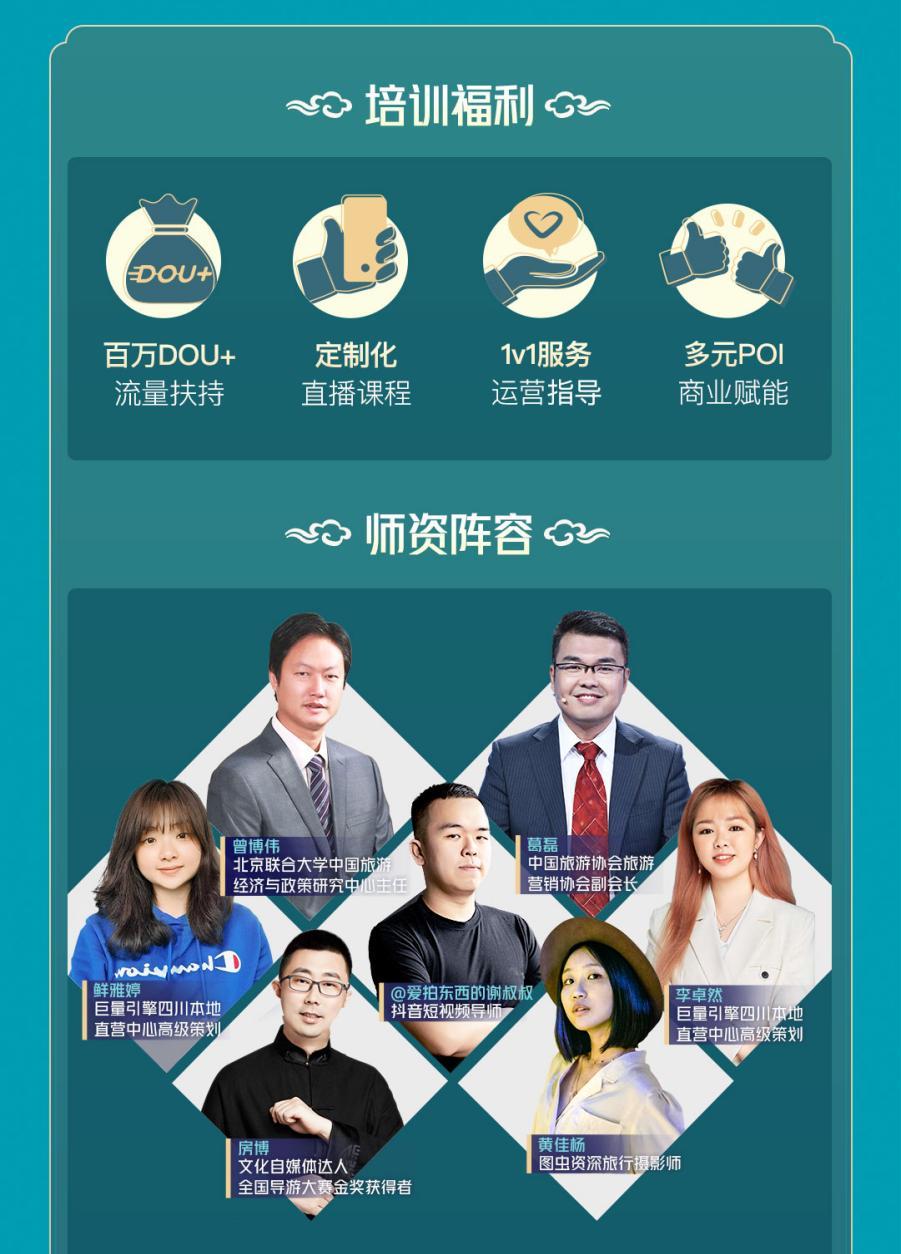 在培訓(xùn)中,北京聯(lián)合大學(xué)中國(guó)旅游經(jīng)濟(jì)與政策研究中心主任曾博偉、中國(guó)旅游協(xié)會(huì)旅游營(yíng)銷(xiāo)分會(huì)副會(huì)長(zhǎng)葛磊等多位業(yè)內(nèi)資深導(dǎo)師,將介紹文旅行業(yè)發(fā)展趨勢(shì);@愛(ài)拍東西的謝叔叔、@房博等抖音創(chuàng)作者則會(huì)分享文旅短視頻內(nèi)容策劃和創(chuàng)作技巧。