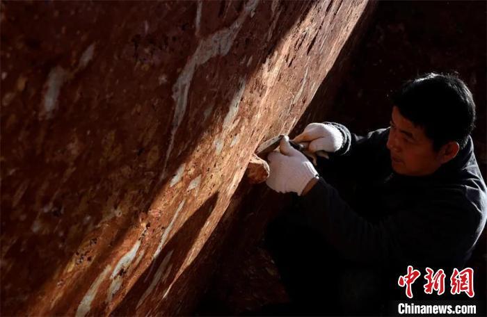 梅亞龍正小心清理一塊舊石器時(shí)代的遺存 吳建勛 攝