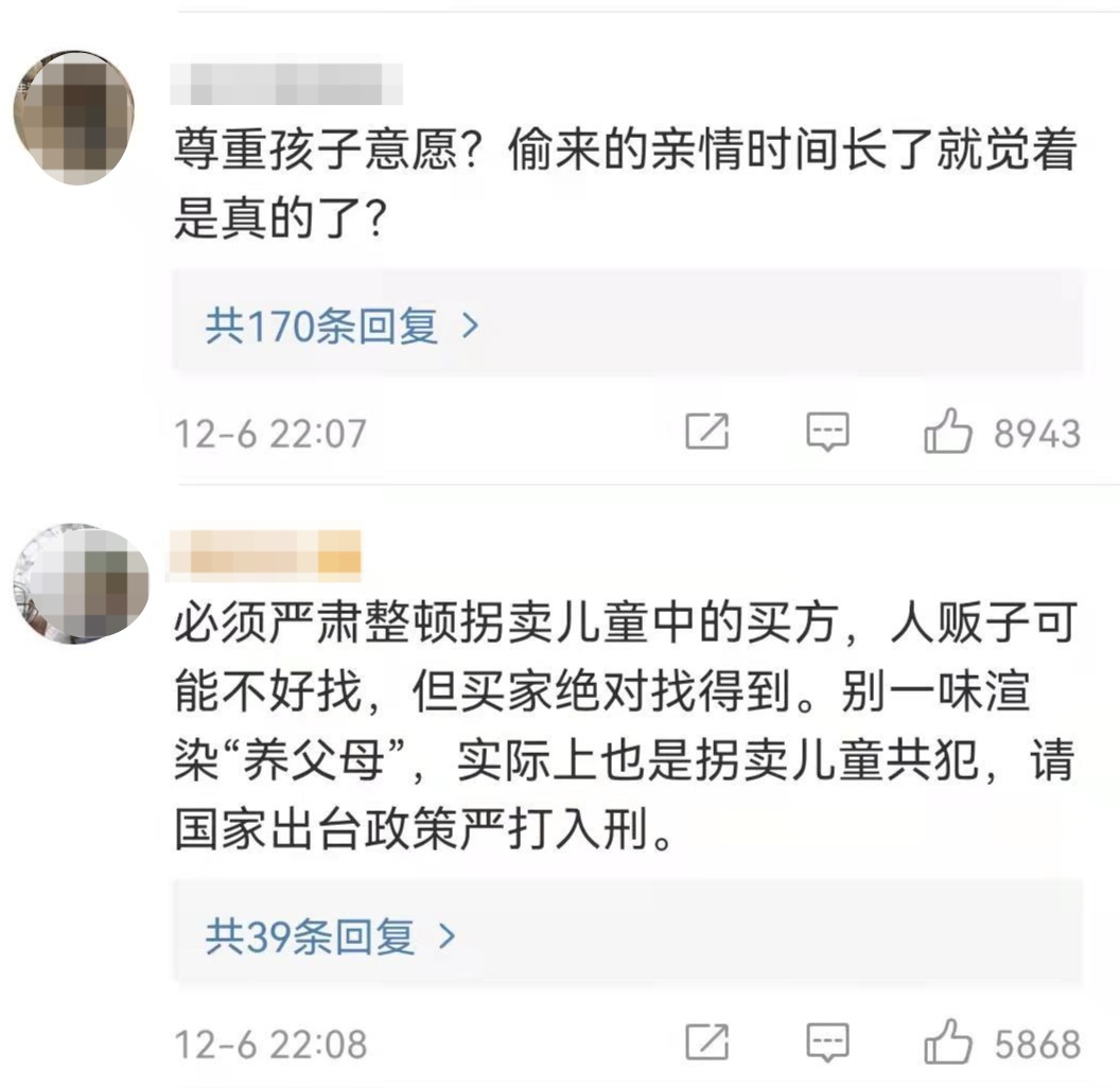 不過,對(duì)于孫卓的“養(yǎng)父母”,網(wǎng)友認(rèn)為“這是偷來的親情”,并旗幟鮮明地站在“買賣同罪”一邊:“無論多有感情,‘養(yǎng)父母’都是拐賣案中的買家,如果一次次縱容不罰,怎么打擊拐賣兒童犯罪?”
