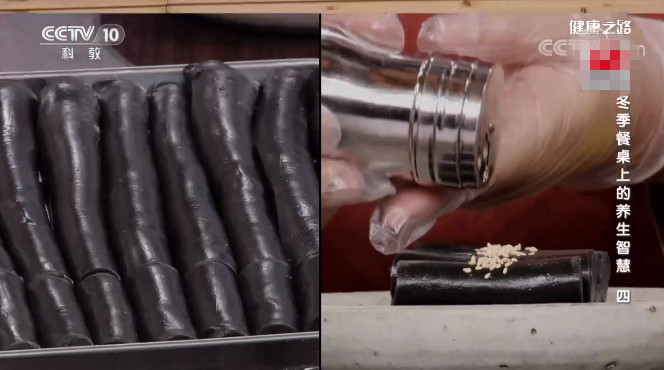 做好這個先把它倒出來,我們現(xiàn)在把一半的水煮開把糖也加進里面,你口味偏清淡的可以就少放,少加一點糖,稍微煮開就可以了。然后我們在里面舀上大概是50克左右,這個勺子小半勺就可以了,把它倒進去,就很快地把它攪拌均勻,稠糊狀。先把一勺放進去攪拌均勻,慢慢地把它倒進里面去。接下來的話就準備蒸了,在家里面的話可以用個碟子,平盤就可以,先把我們做好的黑芝麻糊澆上來,其實做這個甜點的話,在家里面做就非常好,特別有小孩的,肯定喜歡玩。大概蒸2分鐘就可以了。薄薄的一層皮,然后我們馬上放到冰水里面,大概要涼多久呢?看著它不冒煙就可以了,已經(jīng)不冒煙了。您用到的工具是,就在家里邊切面的小塑料板刮一下,然后第一卷就是卷起來就可以了,卷成了一個芝麻卷。把它放在這個盤里面,就把它切成每一段都是這么大的,加上一點點白芝麻,就算制作完成了。