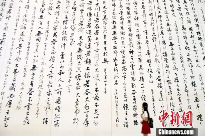 2014年8月,江蘇南京,一位參觀者在欣賞世界最大幅書法作品《道德經(jīng)》全卷。中新社發(fā) 安東 攝