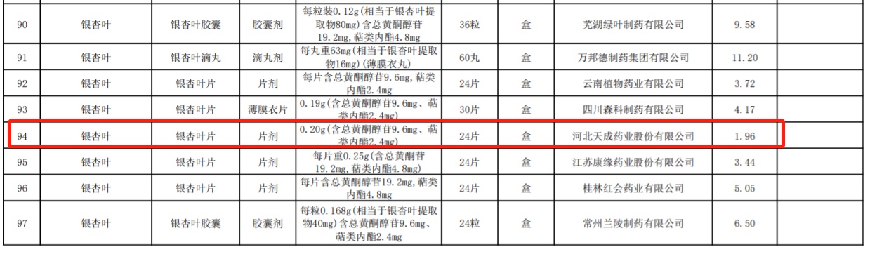在銀杏葉產(chǎn)品組,河北天成藥業(yè)的銀杏葉片(0.20g,含總黃酮醇苷9.6mg、萜類內(nèi)酯2.4mg,24片)擬中選價(jià)格1.96元,相比基準(zhǔn)報(bào)價(jià)7.44元,降幅超過73%,根據(jù)擬中選價(jià)格,單片價(jià)格也低至0.08元,不到1毛錢。