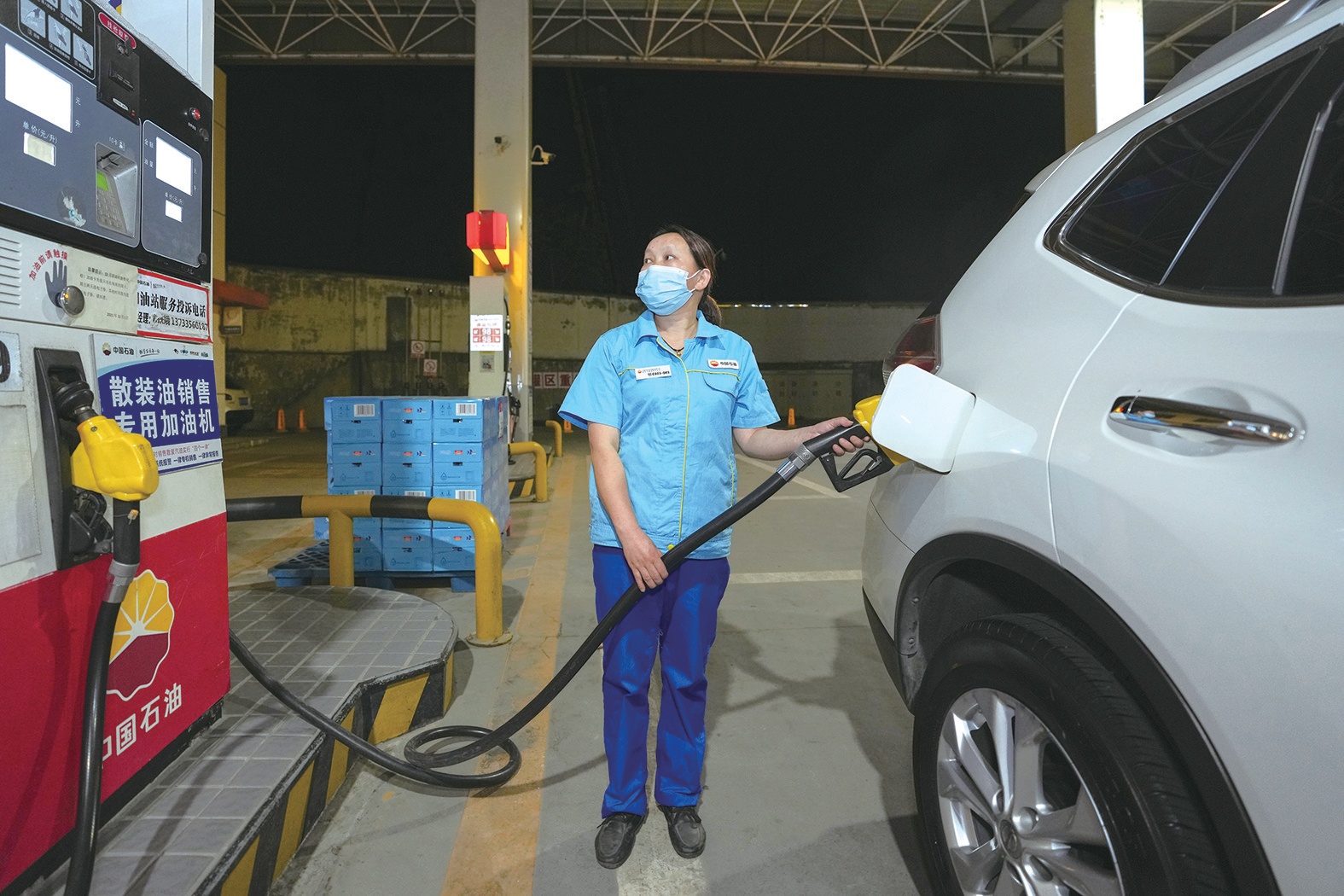 今日凌晨,朝陽路中國石油加油站(商用車站)工作人員給汽車加油。