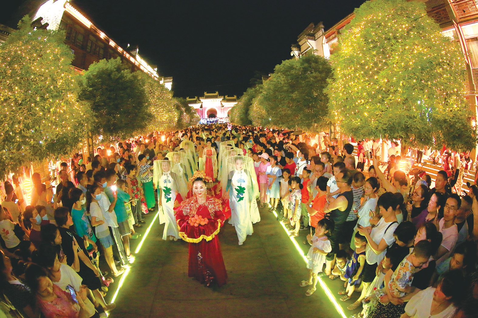 15日至16日晚,在武當山玉虛街舉行的非遺廟會,點亮夜經濟。除了極具看點的武當非遺文化展演,無人機天幕秀也令人震撼,此外,琳瑯滿目的美食極大滿足了游客的味蕾體驗,紅火熱鬧的玉虛街已成為游客夜游武當的打卡地。圖/記者 朱江 特約記者 范學峰