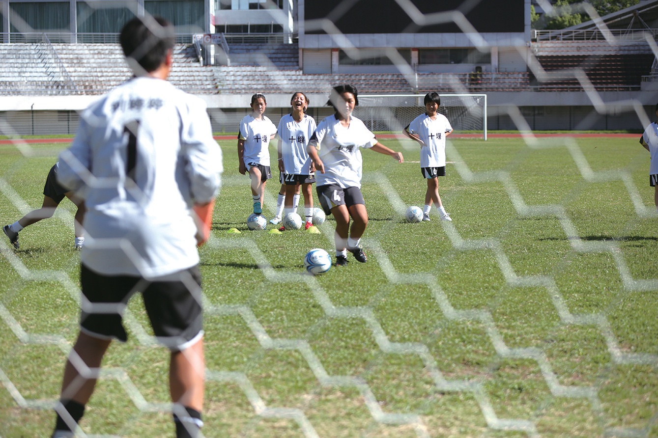 隊(duì)員們?cè)谟?xùn)練場練習(xí)射門。