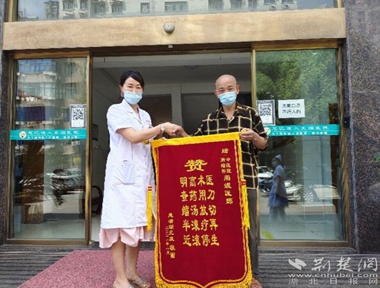 胡爹爹將錦旗送至鄂州市中醫(yī)醫(yī)院腫瘤科周娓主任手上。通訊員供圖