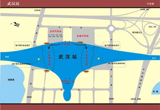 武漢站的設(shè)計(jì)采用四層的立體結(jié)構(gòu)。最上面一層為候車區(qū)和售票區(qū),下面一層為乘車區(qū),檢票后,旅客可以乘電梯直接下到動車旁。再下面為地面層,用于旅客出站以及社會車輛停車。最下面一層為地下層,為地鐵準(zhǔn)備,目前正在施工中。