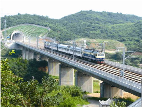 大瑤山位于湘粵交界之處,素有“南嶺險關(guān)”之稱。上世紀80年代,修建衡陽到廣州復(fù)線,建設(shè)者用7年時間在這里修建隧道,全長14公里,是當時國內(nèi)最長的雙線電氣化隧道。這次,武廣客專的方案是修建隧道群,由1號、2號、3號隧道組成,橋隧相連。3條隧道全長25公里,用了3年半全部竣工。