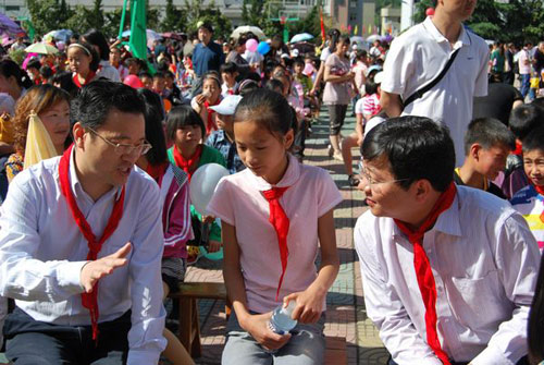 開幕式結(jié)束后,佩戴著少先隊(duì)員敬獻(xiàn)的紅領(lǐng)巾,周森鋒來到同學(xué)們中間,和大家一起唱誦國學(xué)經(jīng)典《鋤禾》、《弟子規(guī)》,觀看文藝節(jié)目,并親切地和身邊的小學(xué)生交談,詢問他們的家庭和學(xué)習(xí)情況,并希望他們積極參加社會(huì)實(shí)踐,鍛煉強(qiáng)健身體,增長才干。